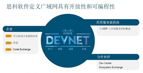 除了提供卓越的安全和應(yīng)用體驗(yàn)外,思科SD-WAN還具備開放性與可編程性。曹圖強(qiáng)表示,“首先,思科將通過 DevNet 開發(fā)平臺(tái)向所有用戶開放API,為開發(fā)人員提供更大價(jià)值;其次,對(duì)合作伙伴而言,思科希望提供一個(gè)可交互的平臺(tái)幫助用戶進(jìn)行分享。任何用戶有特殊的需求,可以在DevNet 與大家分享。具體來說,在整個(gè)安全的廣域網(wǎng)部署中, IT人員可以通過開放的平臺(tái),根據(jù)不同的環(huán)境和需求進(jìn)行二次開發(fā)!