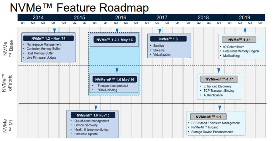 第一個(gè)NVMe規(guī)范逐漸增加了更新的功能——1.2版本中的實(shí)時(shí)固件更新和1.3版本中的清理功能已經(jīng)在SCSI和SATA中很常見(jiàn)了。明年年中推出NVMe 1.4版本將增加IO Determinism功能,以確?缇W(wǎng)絡(luò)和存儲(chǔ)的緊密且一致的延遲。同時(shí),新增的管理規(guī)范也提供了管理設(shè)備機(jī)箱的能力。