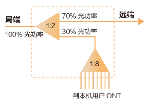 不等比分光器(如圖1)是把局端來的100%光功率信號進行不等比例分光,70%的光功率輸出到遠(yuǎn)端,30%的光功率留用到本機用戶,再進行等比例分光到本機用戶。雖然本機用戶僅留分了30%的光功率,但也能夠滿足本機用戶的需要。