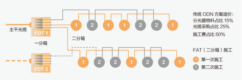 通常,一個ODN工程項目,分光器的物料及其安裝費用僅僅占了工程項目總投資的15%不到,85%以上的投資均與光纖有關(guān),光纖數(shù)量越多,物料成本和施工成本就越高。因此,不等比例分光是FTTH網(wǎng)絡(luò)的先進技術(shù)方案,是一個革命性的大變革。
