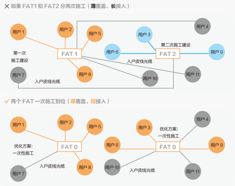 當(dāng)FAT1首先裝滿,沒有空閑端口了,在FAT1周邊的新用戶(如用戶7)無奈需要連接到FAT2。同樣,入戶安裝距離太長,大大增加了入戶裝機成本。