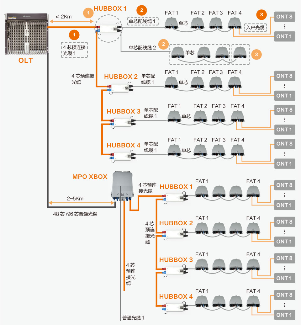 此方案(如圖9)包含三個盒子,即HUBBOX、SUBBOX、ENDBOX和三根纜,即MPO光纜、單芯配線纜、入戶光纜。每個HUBBOX對4個GPON口的纖芯進行1:2分光,輸出8條鏈路。SUBBOX是不等比分光,可級聯(lián)4個FAT,每個FAT可連接8個用戶。離OLT較遠(yuǎn)的區(qū)域可用普通光纜+MPO XBOX方案,XBOX不僅可以直接與12芯預(yù)連接光纜相連,還可以與普通光纜連接輸出。方案全程預(yù)連接,非常適合架空場景,安裝效率高、故障率低。