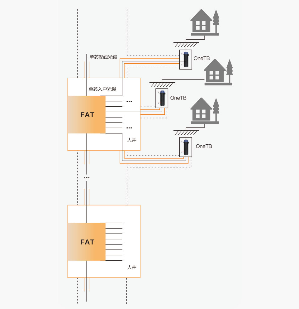 圖12中FAT為第二級分光器,建議安裝在人井的壁上,可根據(jù)住戶的密集程度選用8端口FAT或4端口FAT,F(xiàn)AT至用戶住址采用預(yù)連接方式,在用戶門口(墻外)布放OneTB(地平面之下)。FAT至OneTB采用預(yù)連接光纜可與配線段光纜同溝縱向布放,此段預(yù)連接光纜可外加一層保護管,到用戶門口位置再橫向挖溝,與OneTB相連。
